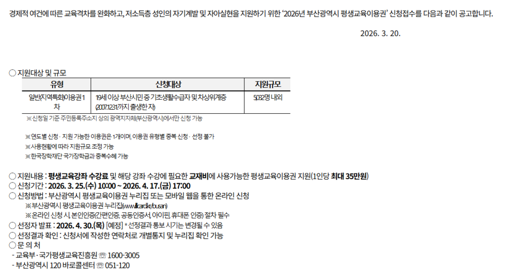 아래 배너 클릭 시, 부산평생교육이용권 신청 누리집으로 이동합니다.